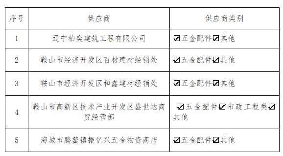 根據(jù)2024年5月11日發(fā)布的《供應(yīng)商入庫(kù)公告》要求,經(jīng)過(guò)報(bào)名篩選和資質(zhì)審查等程序,確定了5家供應(yīng)商符合入庫(kù)條件。現(xiàn)公布經(jīng)過(guò)篩選的供應(yīng)商入庫(kù)清單,名單如下: